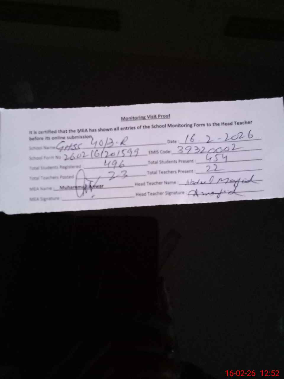 | Certified that this School was Inspected by the Undersigned MEA/DMO Today and the Information Stated Above is as Per Record. | |||||