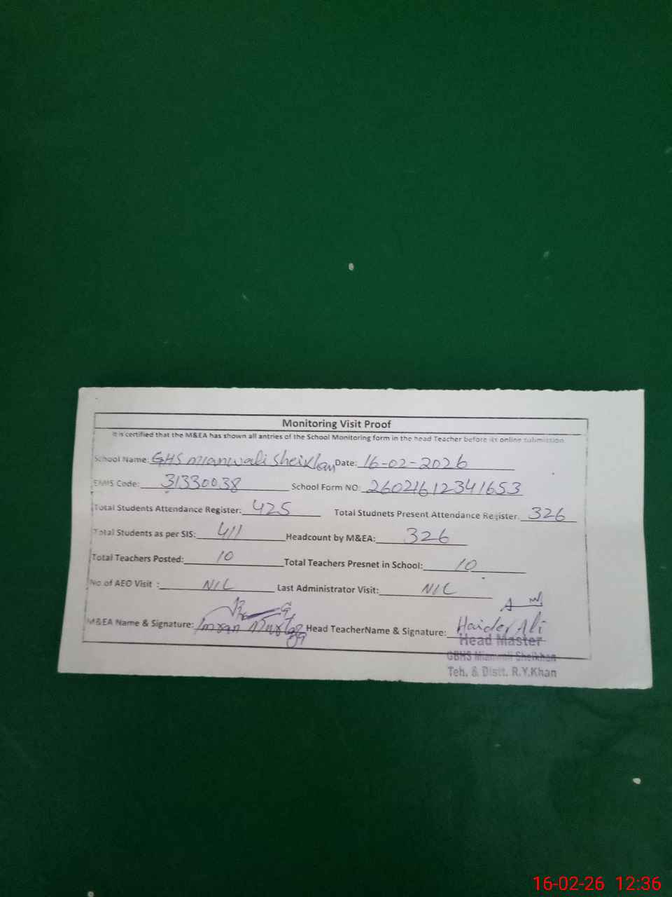 | Attendance Register | Head Teacher | MEA with School | Visit Proof |