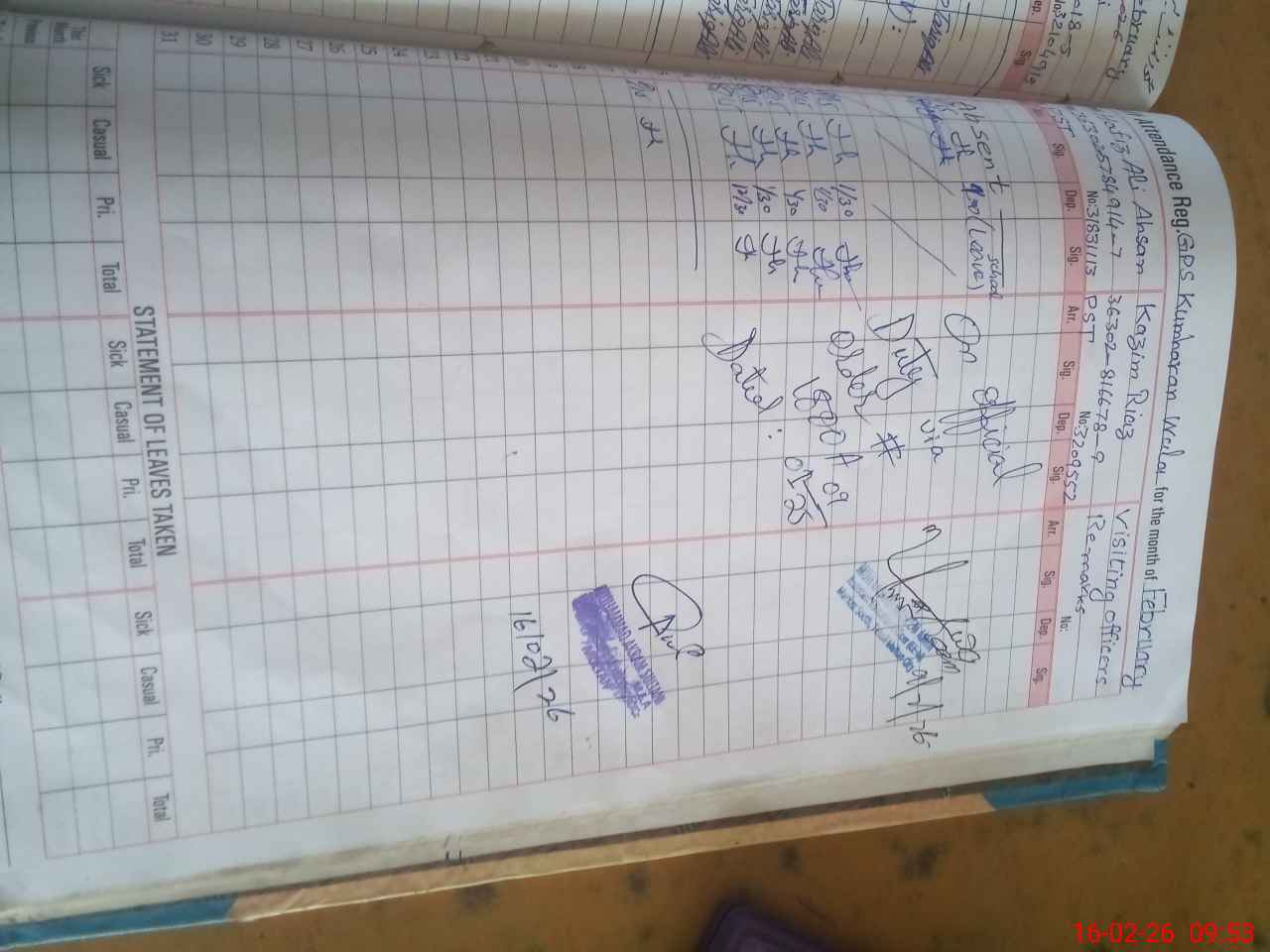 | CNIC | Full Name | Designation | R/C | Absence During Last Calender Month |