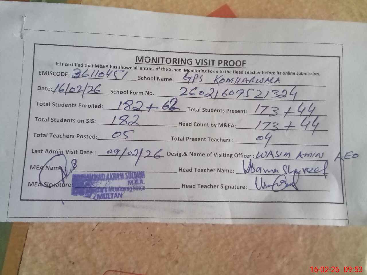 | Attendance Register | Head Teacher | MEA with School | Visit Proof |