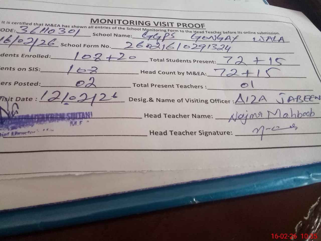 | EMIS Code: 36110301 | Name of School: GGPS GONGAY WALA | |||