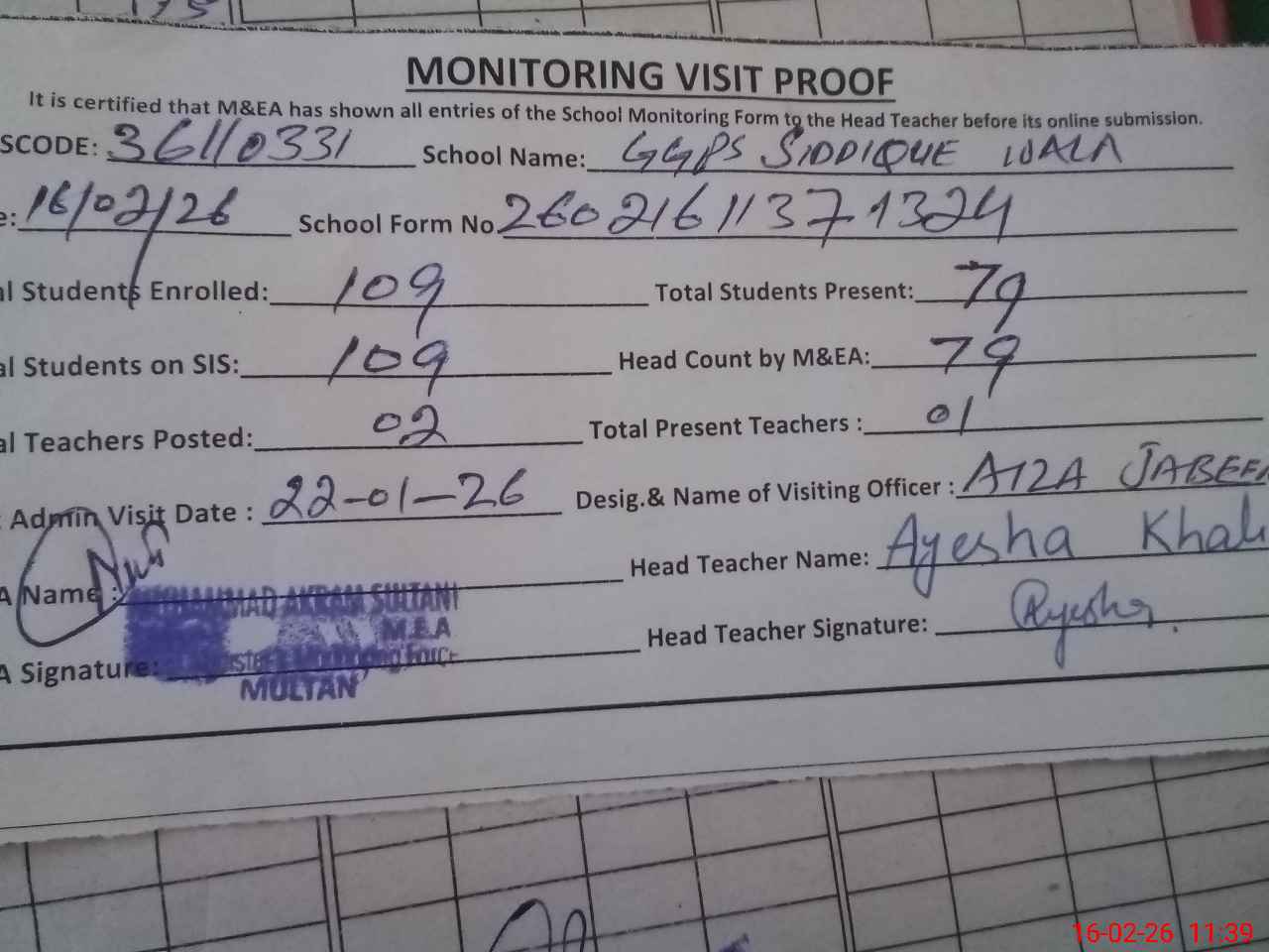 | Attendance Register | Head Teacher | MEA with School | Visit Proof |