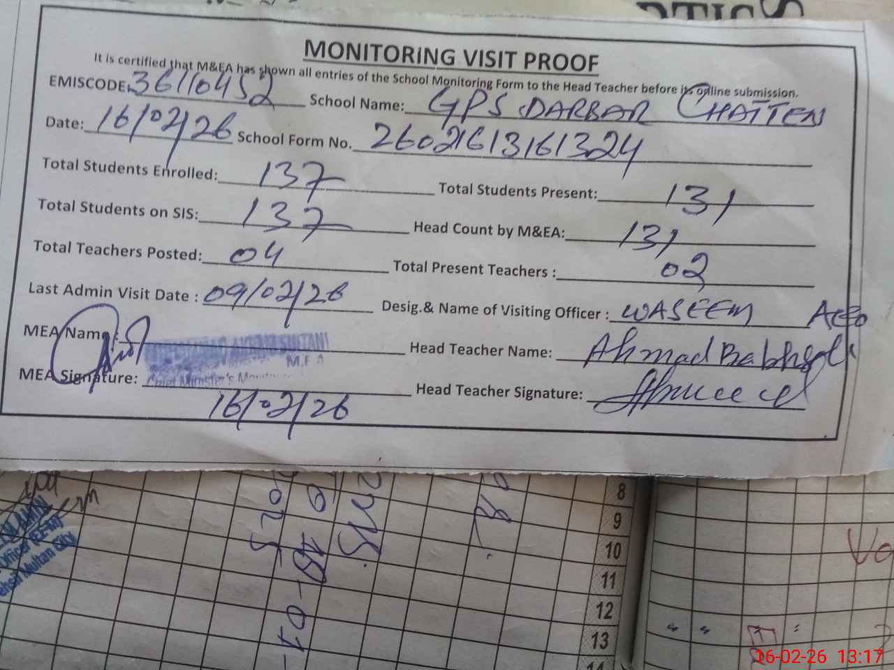 | Attendance Register | Head Teacher | MEA with School | Visit Proof |