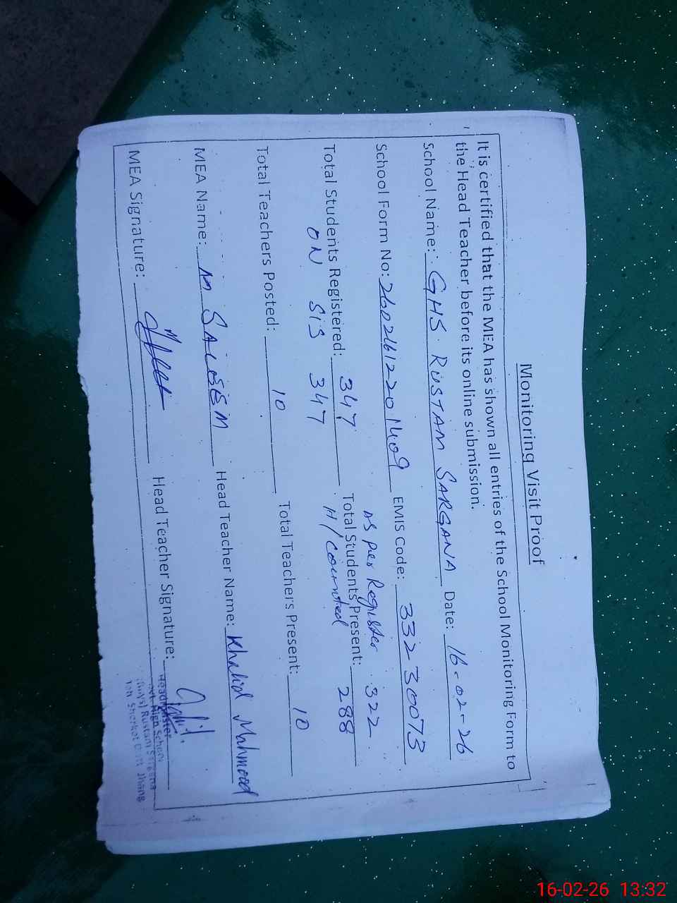 | Attendance Register | Head Teacher | MEA with School | Visit Proof |