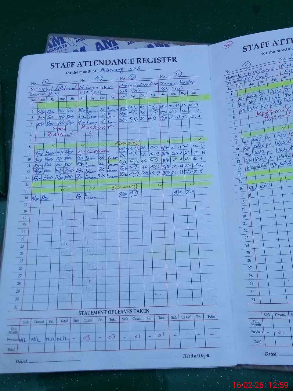 | CNIC | Full Name | Designation | R/C | Absence During Last Calender Month |