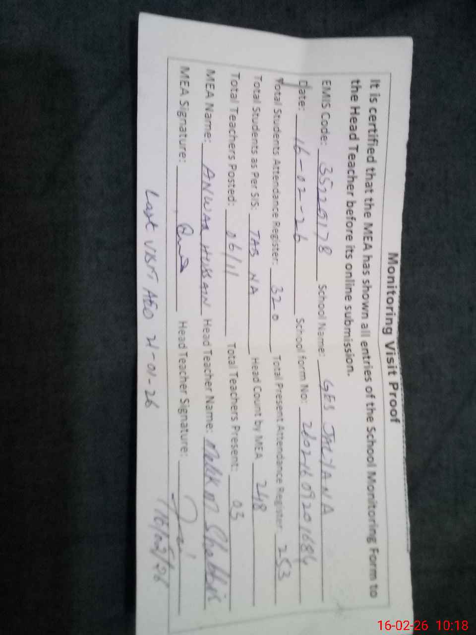 | Attendance Register | Head Teacher | MEA with School | Visit Proof |