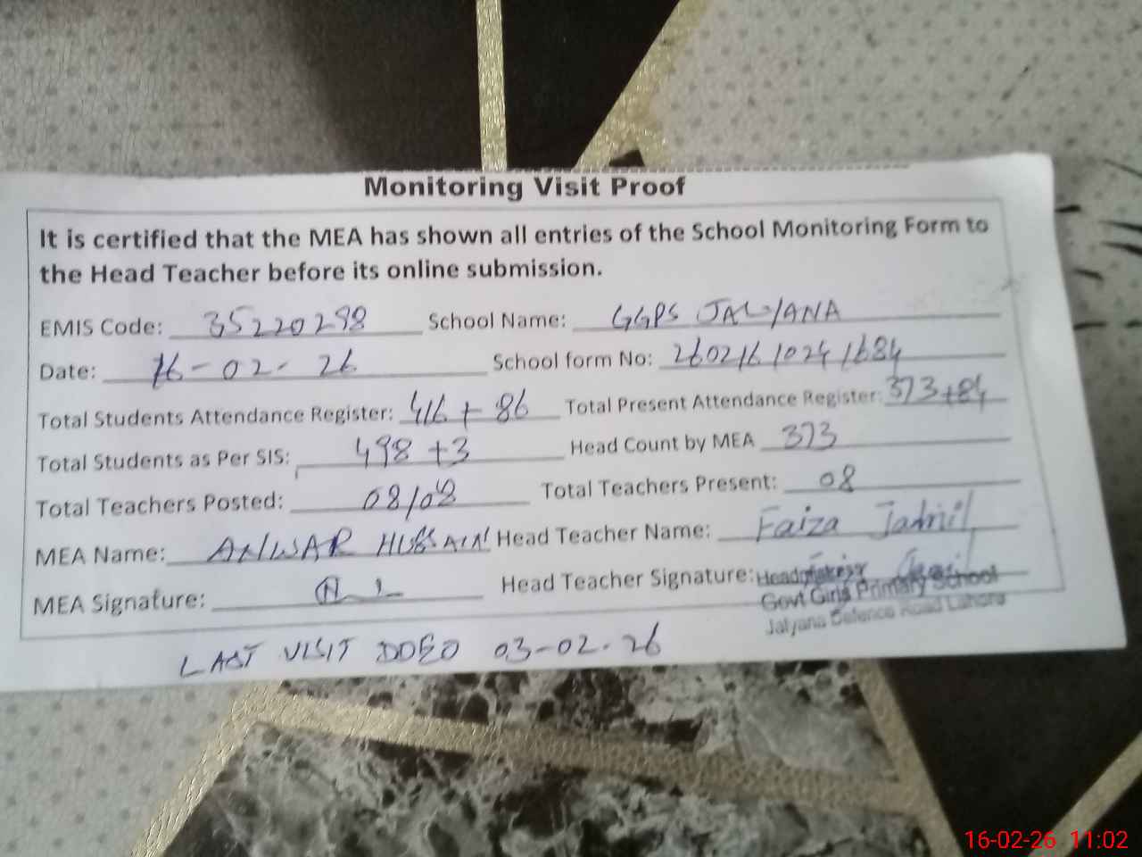 | Remarks (Use Separate Page if Required): Last visit DDEO on 03 February 2026 02 class Room under construction | |||||