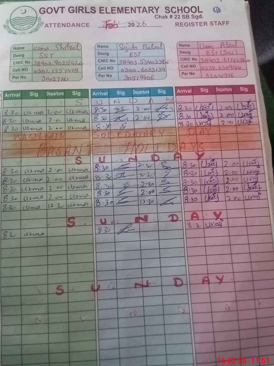 | Name: UZ**** SH**** Designation: (School Headmaster's/Headmistress's) SST Phone/Cell Number: 03**** |