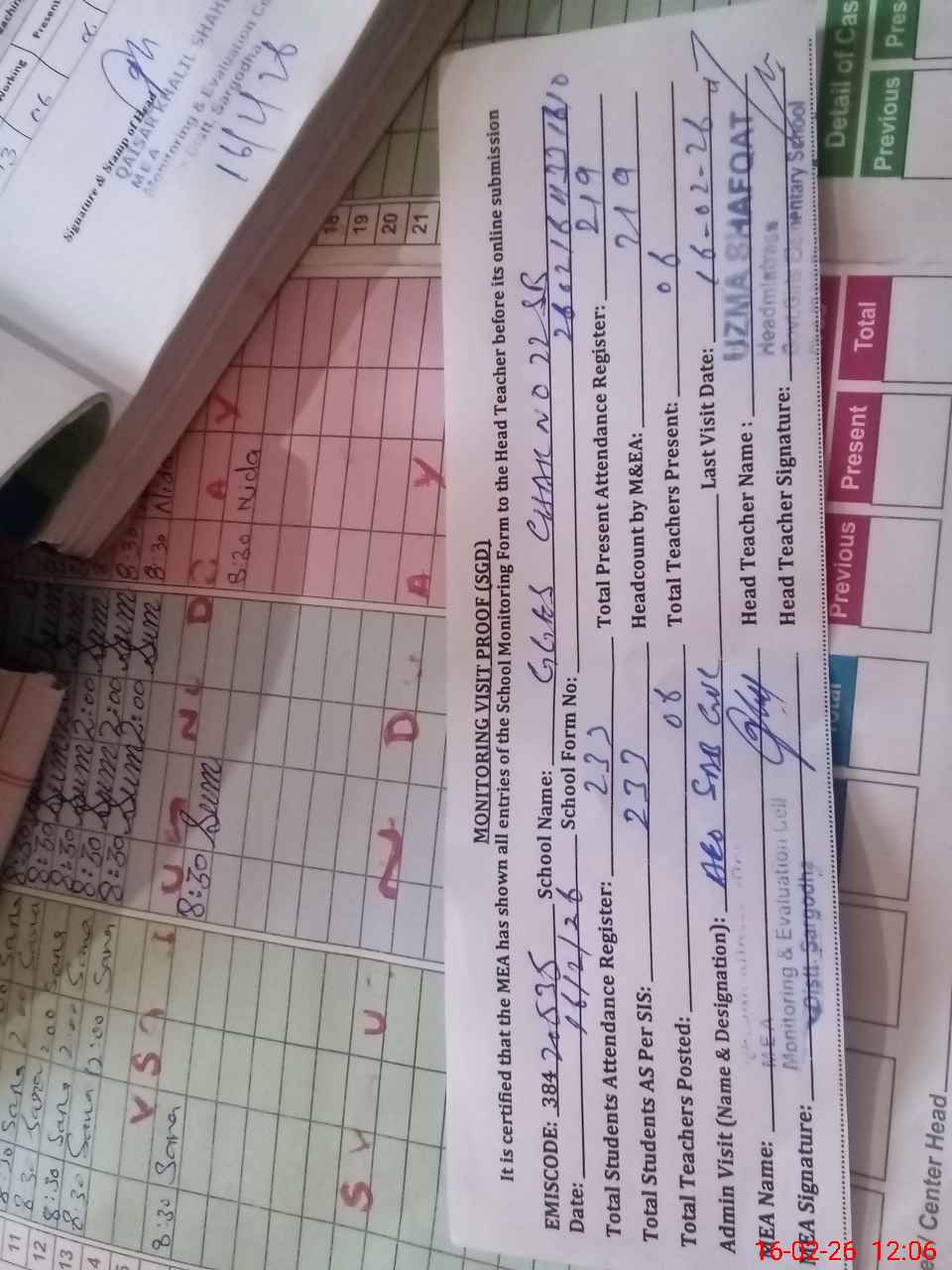 | Attendance Register | Head Teacher | MEA with School | Visit Proof |