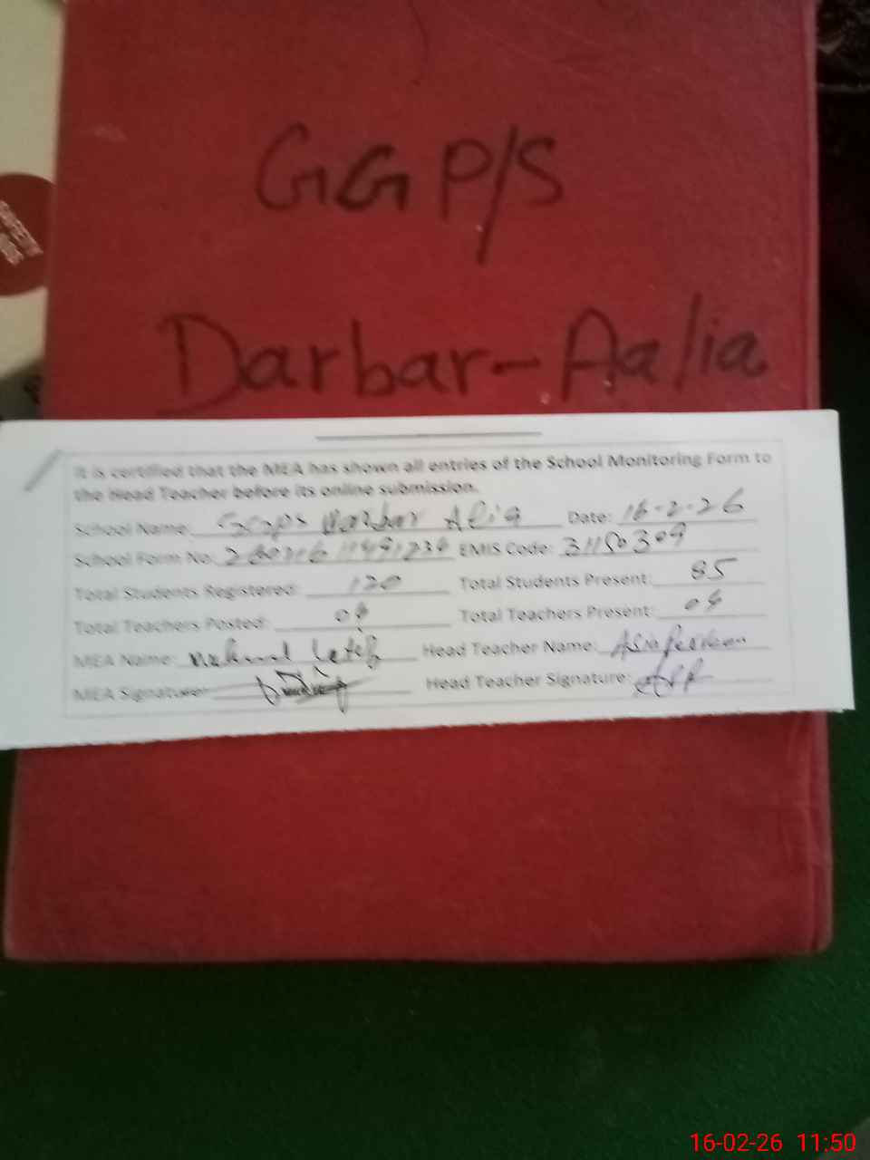 | EMIS Code: 31150309 | Name of School: GGPS DARBAR AALIA | |||