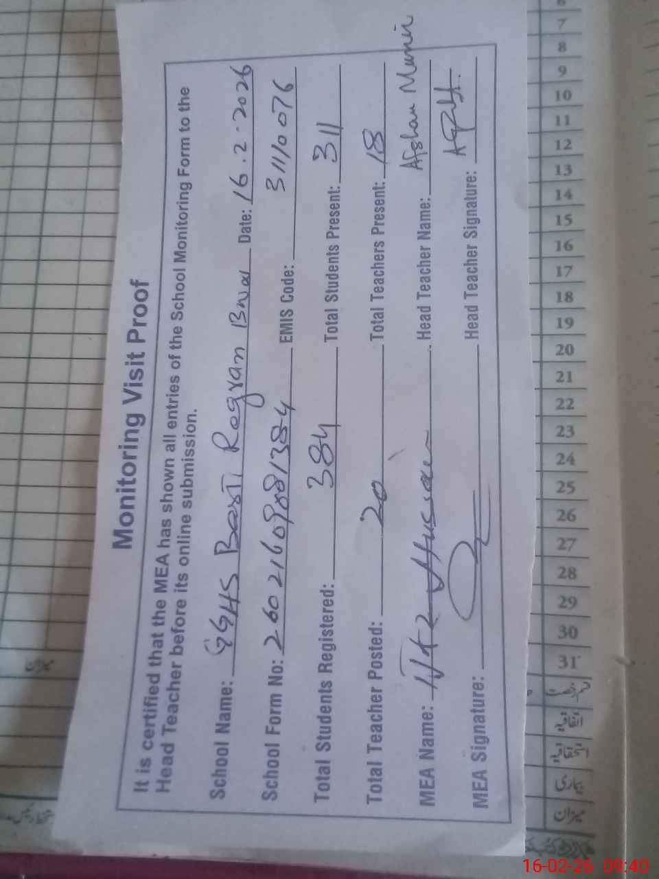 | Attendance Register | Head Teacher | MEA with School | Visit Proof |