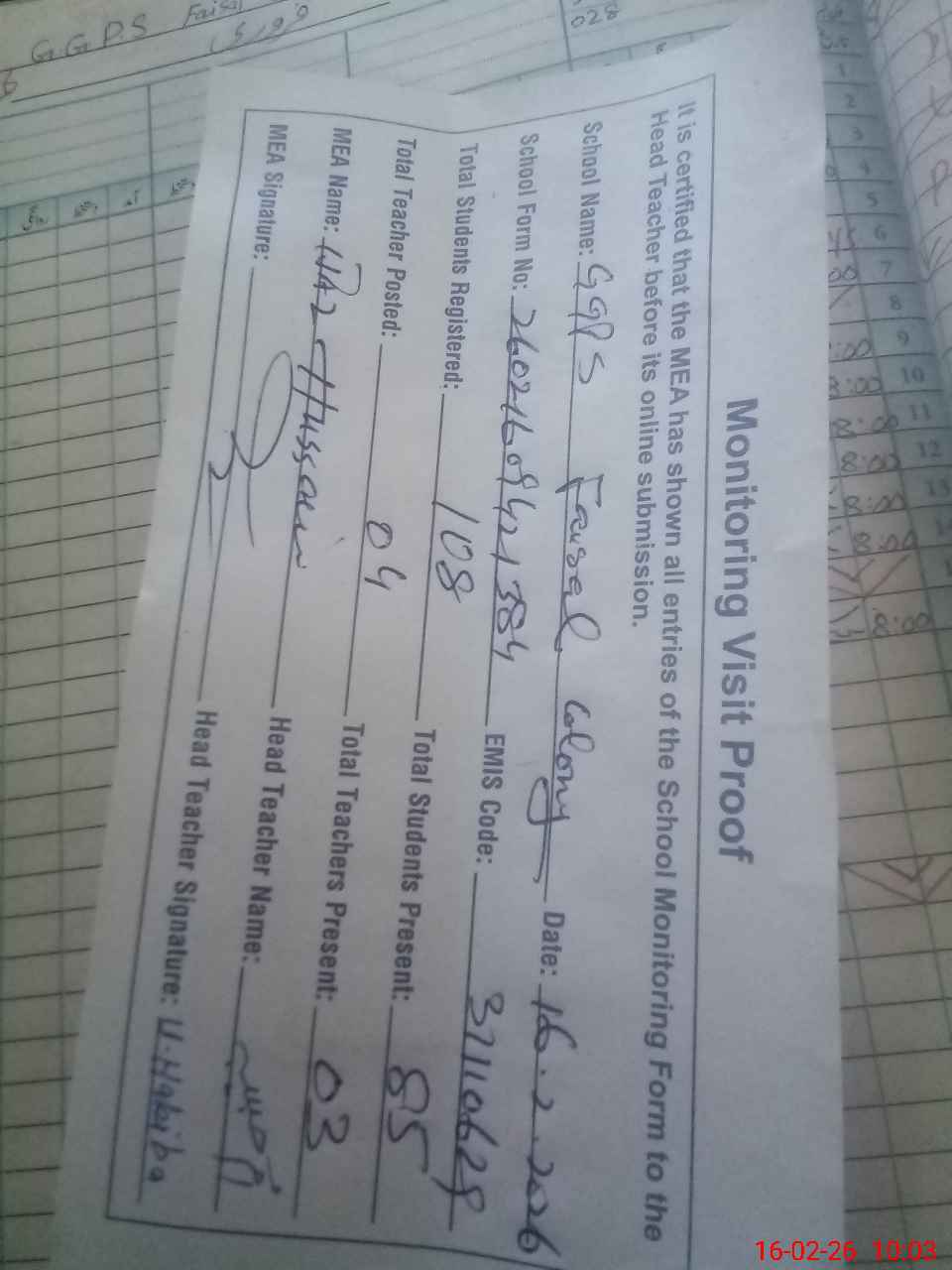 | EMIS Code: 31110629 | Name of School: GGPS FAISAL COLONY | |||