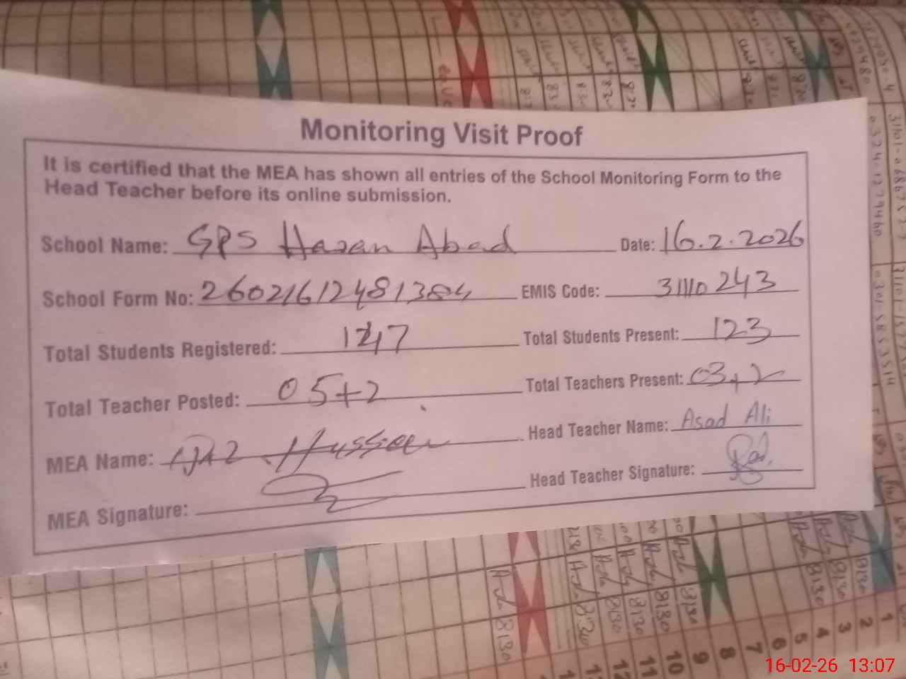 | Attendance Register | Head Teacher | MEA with School | Visit Proof |