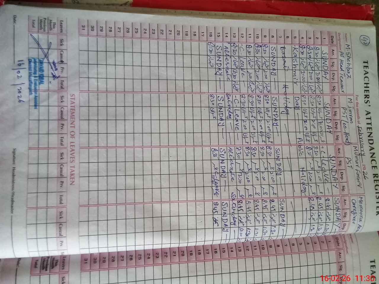 | CNIC | Full Name | Designation | R/C | Absence During Last Calender Month |