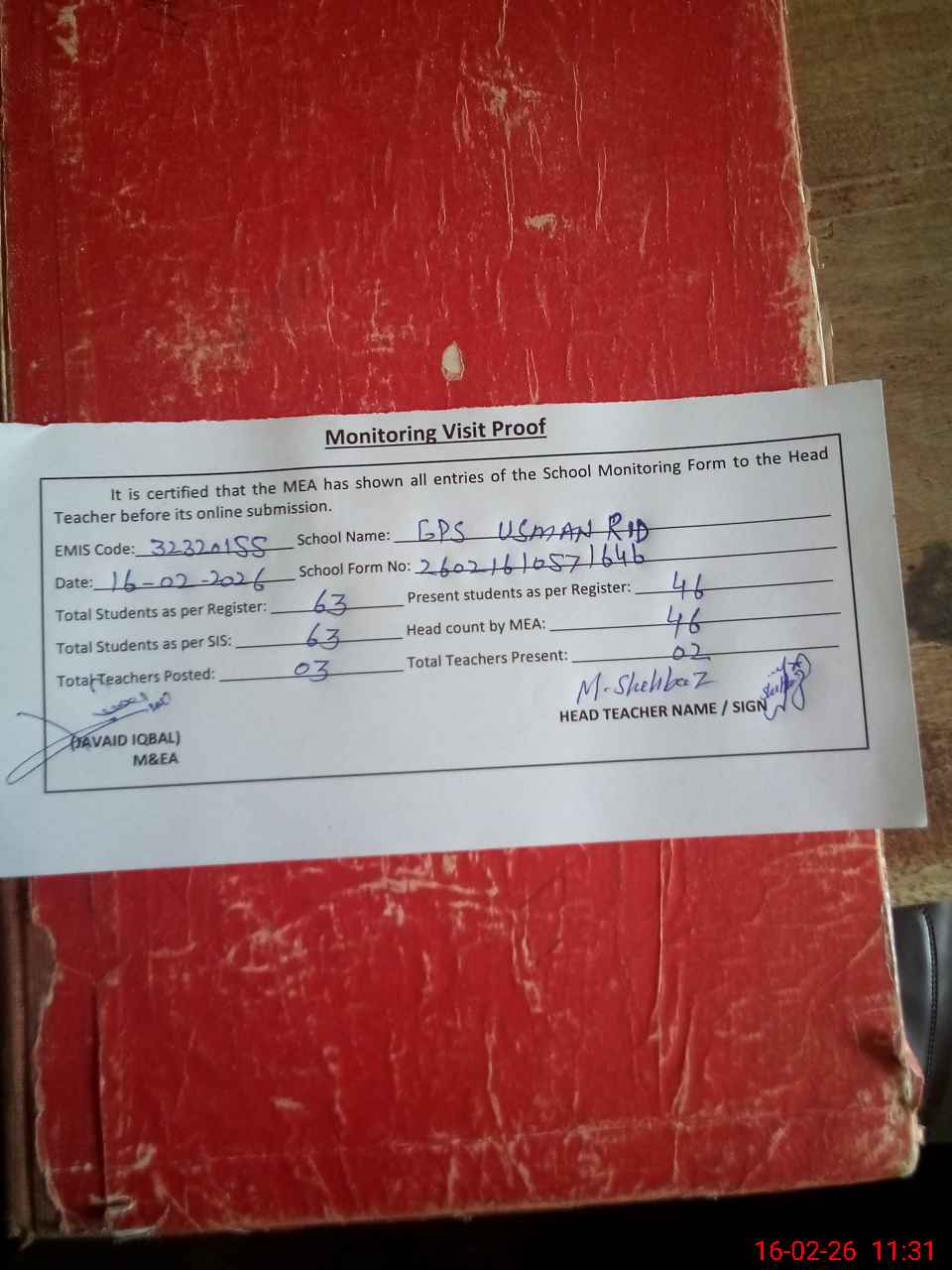 | Attendance Register | Head Teacher | MEA with School | Visit Proof |