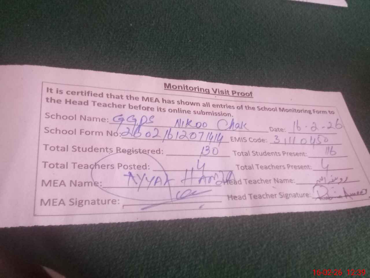 | Attendance Register | Head Teacher | MEA with School | Visit Proof |