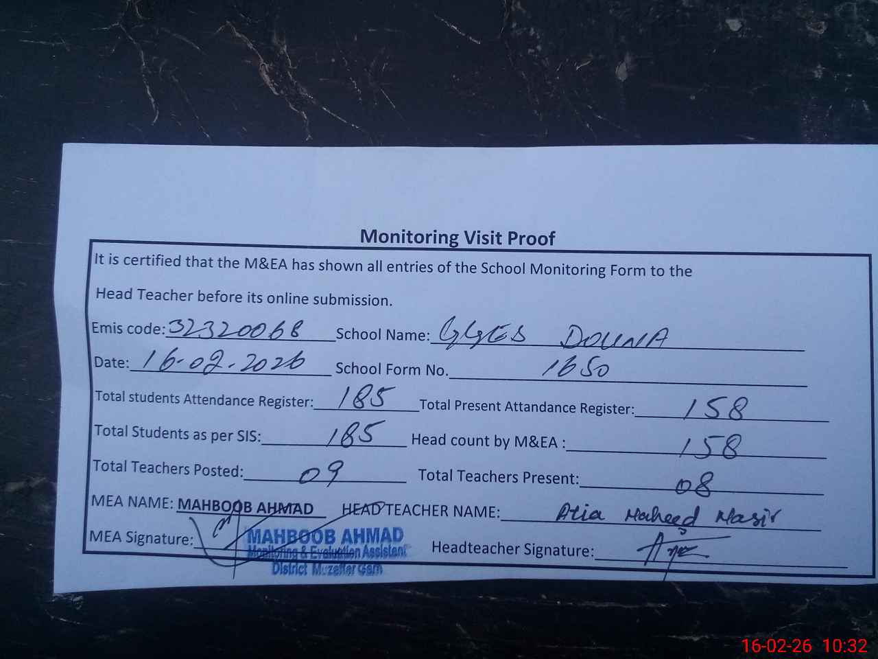 | Attendance Register | Head Teacher | MEA with School | Visit Proof |