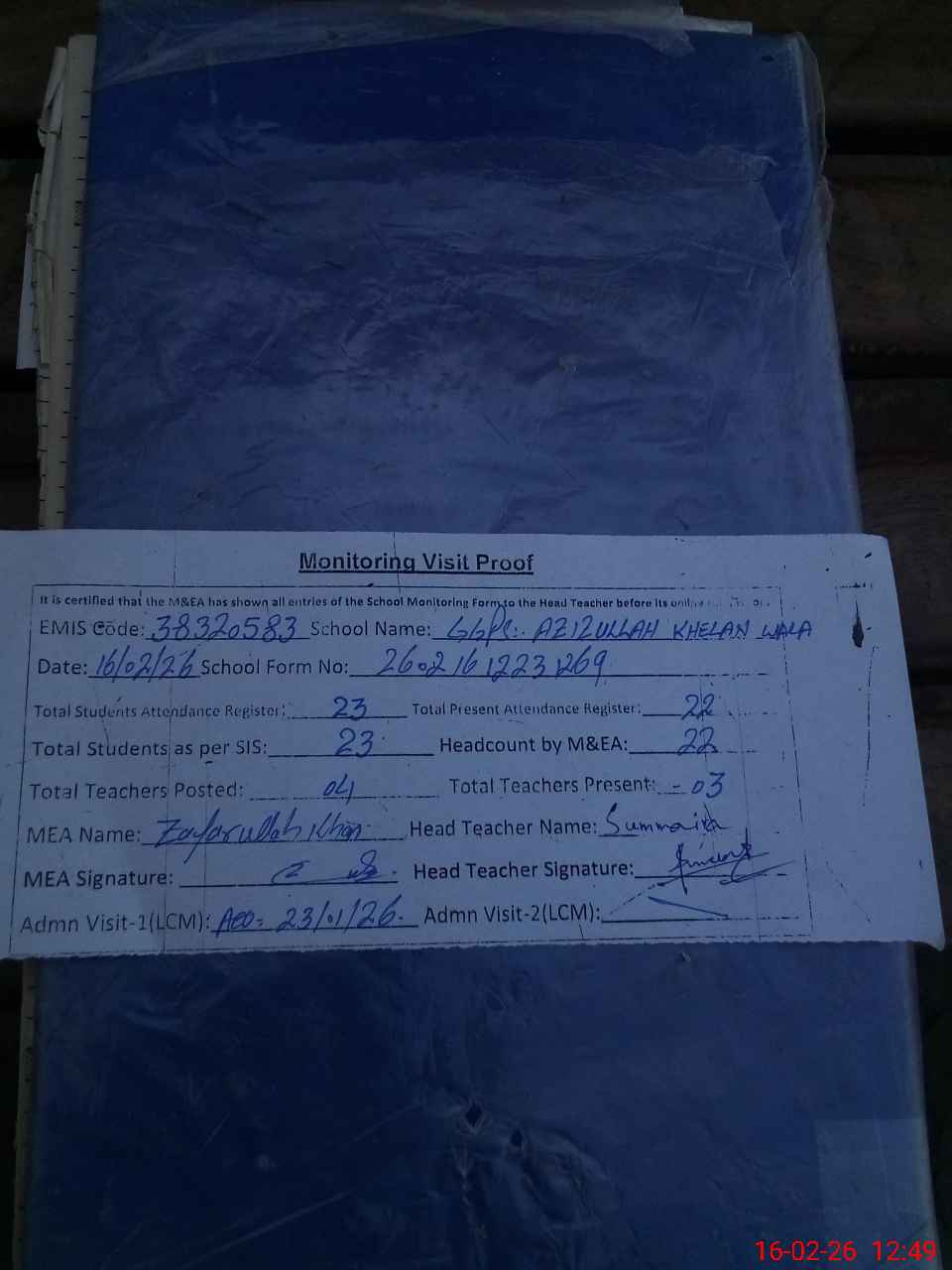 | EMIS Code: 38320583 | Name of School: GGPS AZIZ ULLAH KHELAN WALA | |||