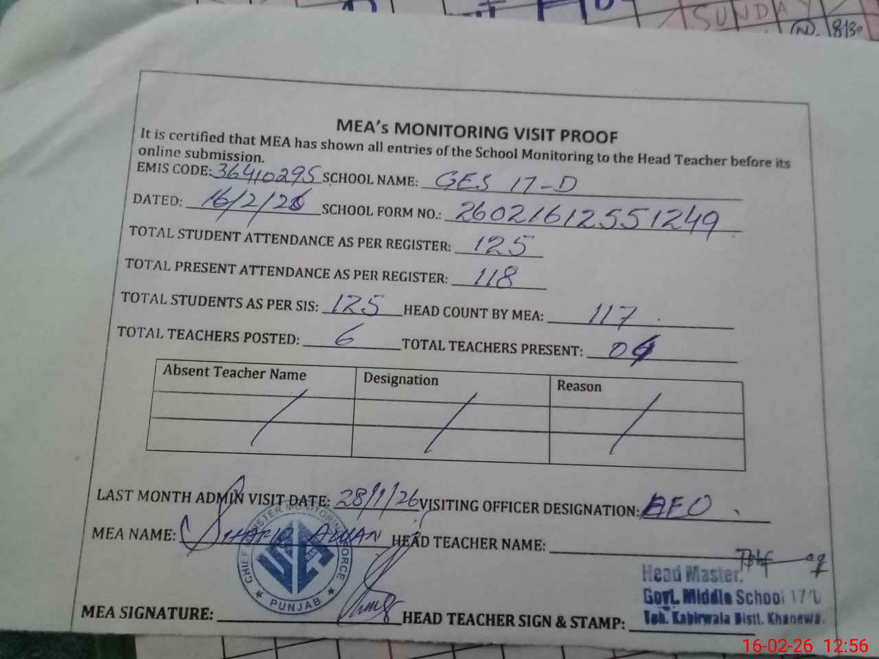 | EMIS Code: 36410295 | Name of School: GES 17/D, P/O DARKHANA, ABDUL HAKIM | |||
