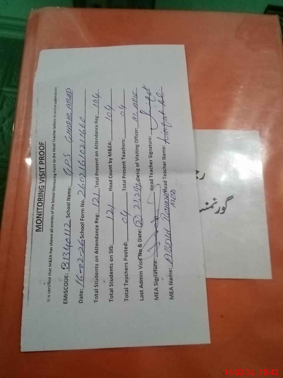 | Attendance Register | Head Teacher | MEA with School | Visit Proof |