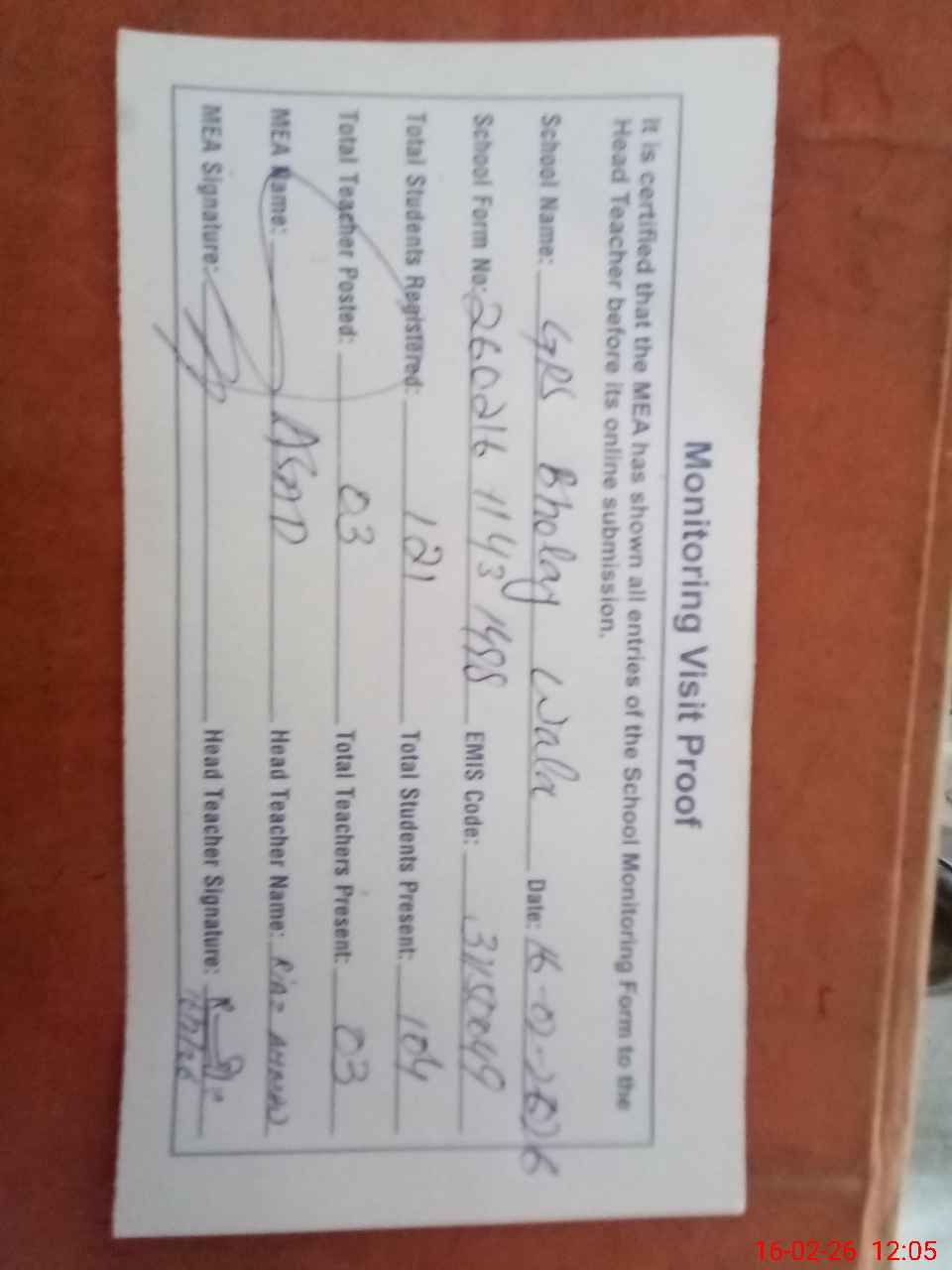 | Attendance Register | Head Teacher | MEA with School | Visit Proof |