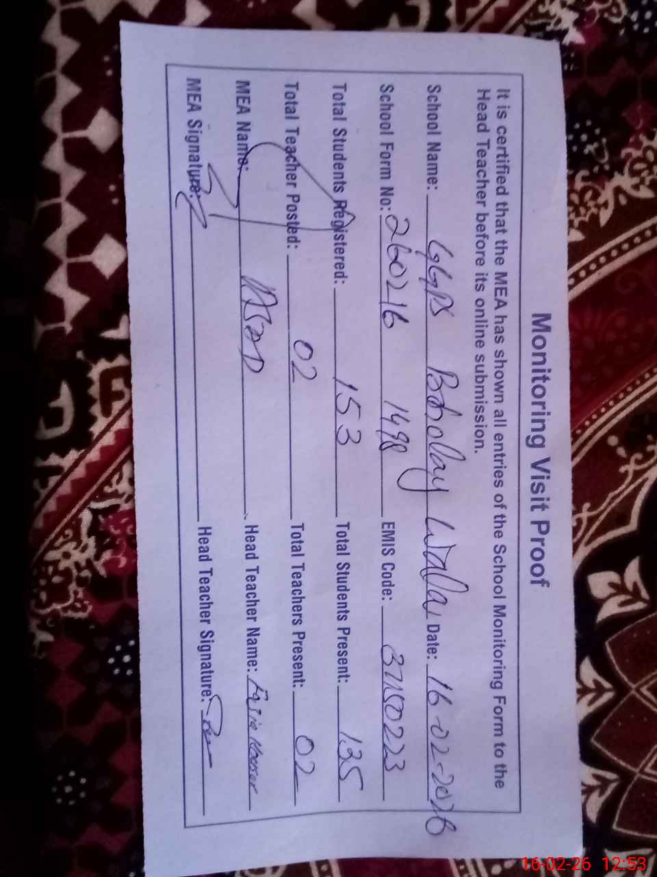 | Attendance Register | Head Teacher | MEA with School | Visit Proof |