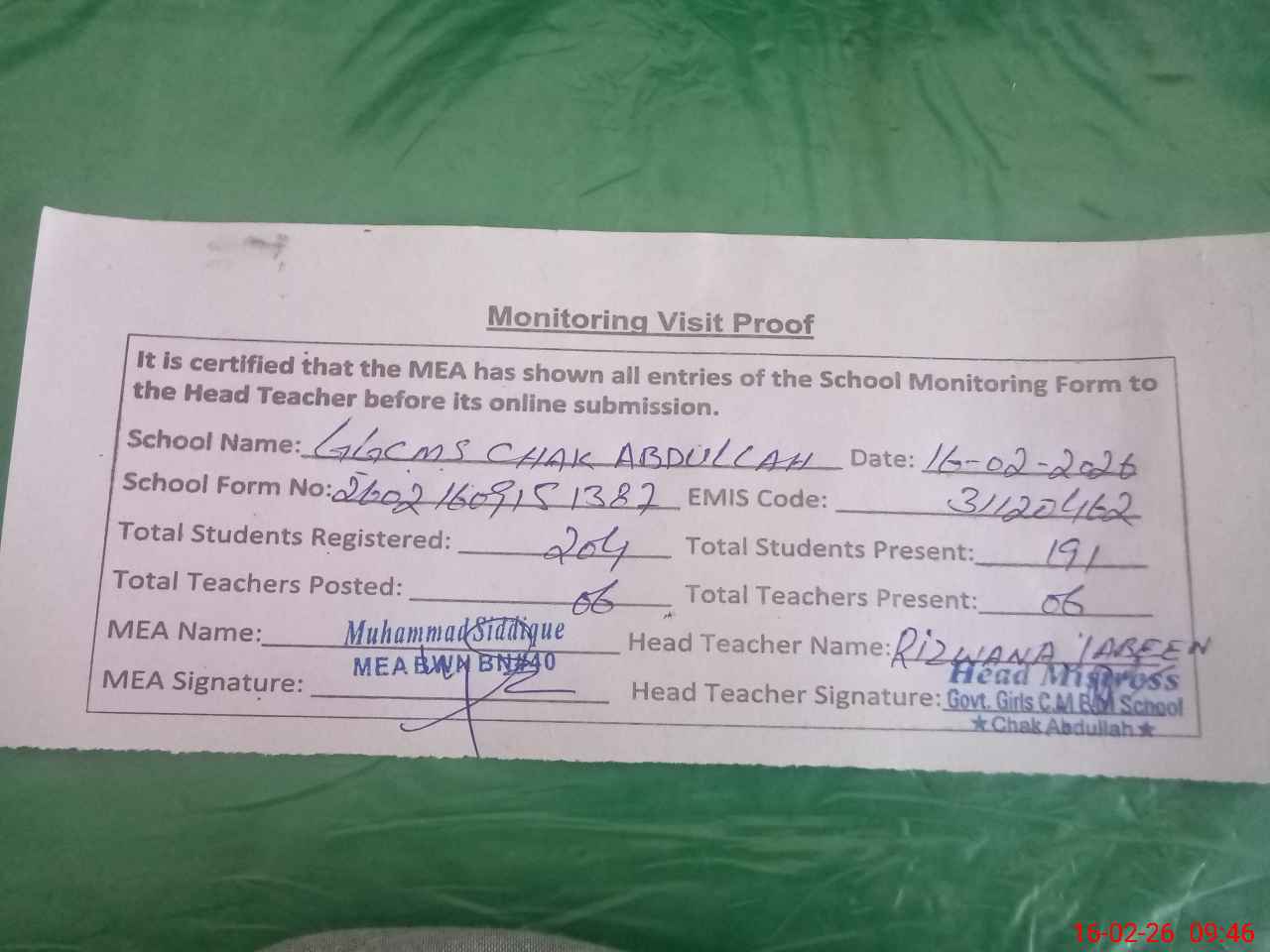 | Certified that this School was Inspected by the Undersigned MEA/DMO Today and the Information Stated Above is as Per Record. | |||||