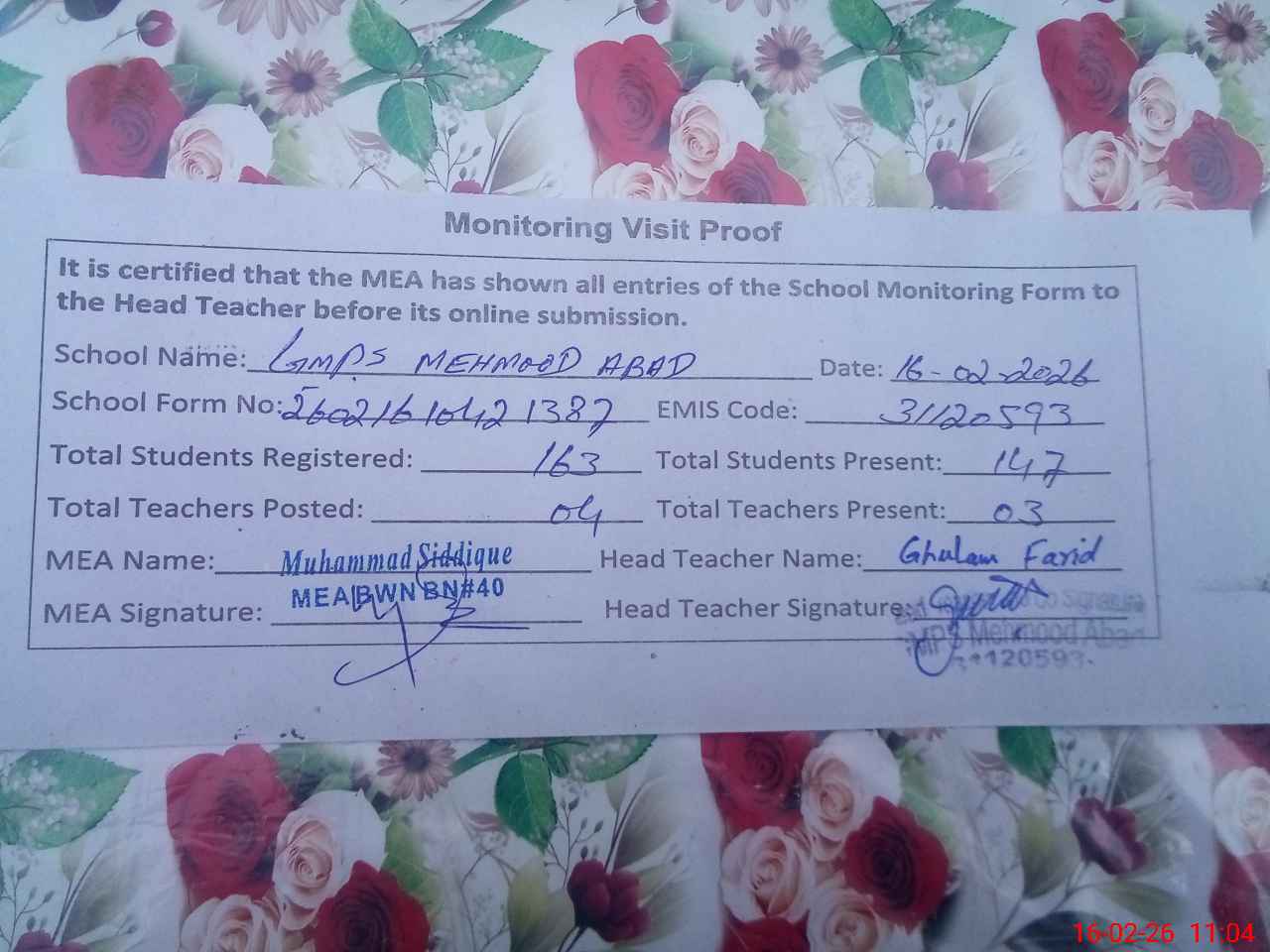 | EMIS Code: 31120593 | Name of School: GMPS MEHMOOD ABAD | |||