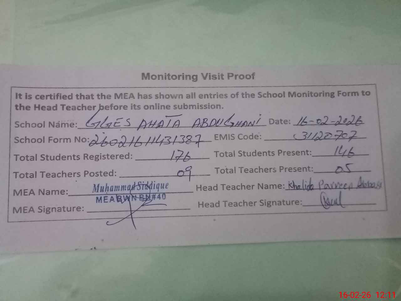 | Attendance Register | Head Teacher | MEA with School | Visit Proof |