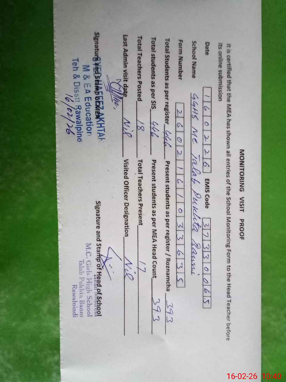 | EMIS Code: 37330065 | Name of School: GGHS MC TALAB PUKHTA BANNI | |||