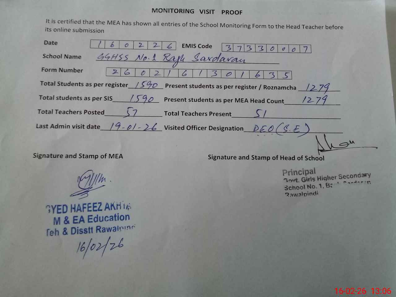 | EMIS Code: 37330007 | Name of School: GGHSS NO.1 BAGH SARDARAN RAWALPINDI CITY | |||