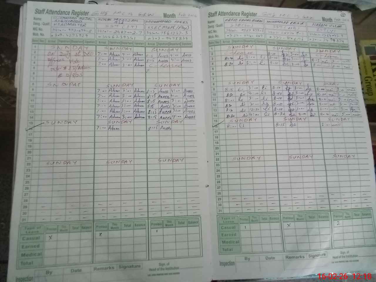 | CNIC | Full Name | Designation | R/C | Absence during last cal. month |