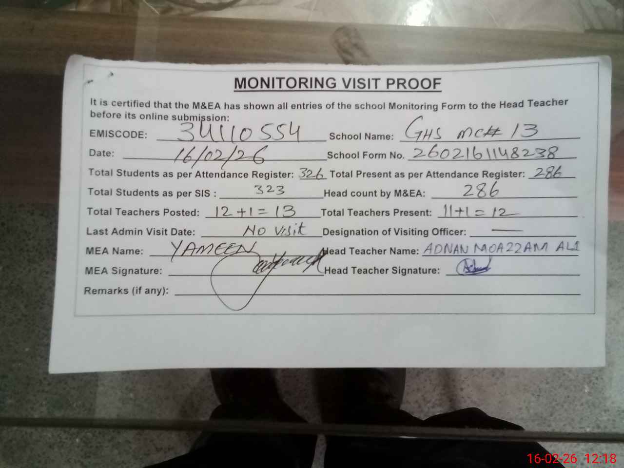 | Attendance Register | Head Teacher | MEA with School | Visit Proof |