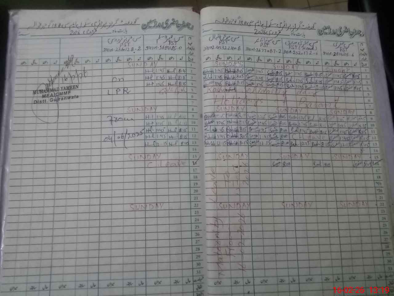 | CNIC | Full Name | Designation | R/C | Absence During Last Calender Month |