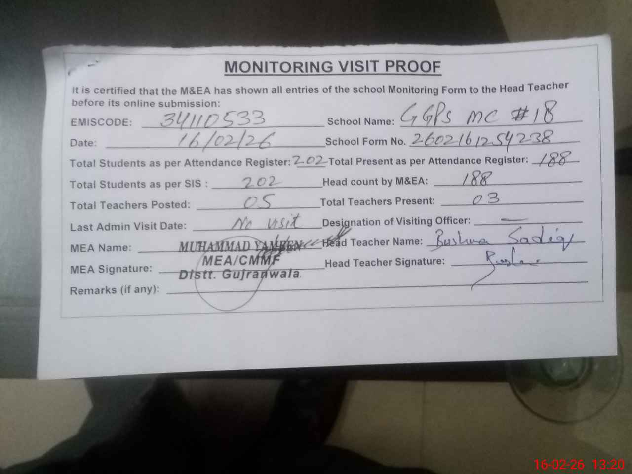 | Attendance Register | Head Teacher | MEA with School | Visit Proof |