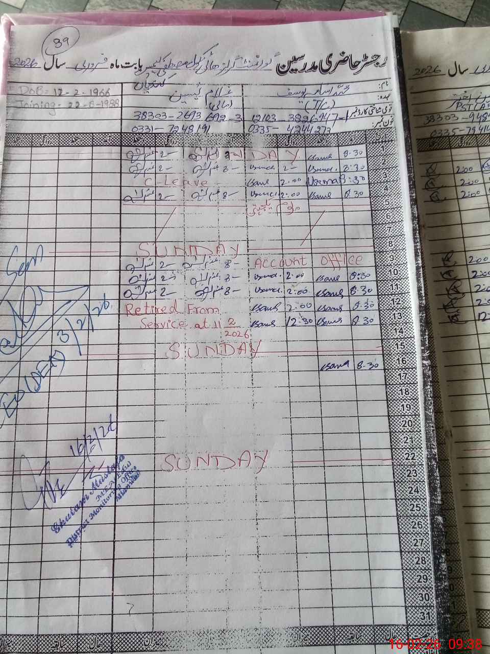| CNIC | Full Name | Designation | R/C | Absence During Last Calender Month |