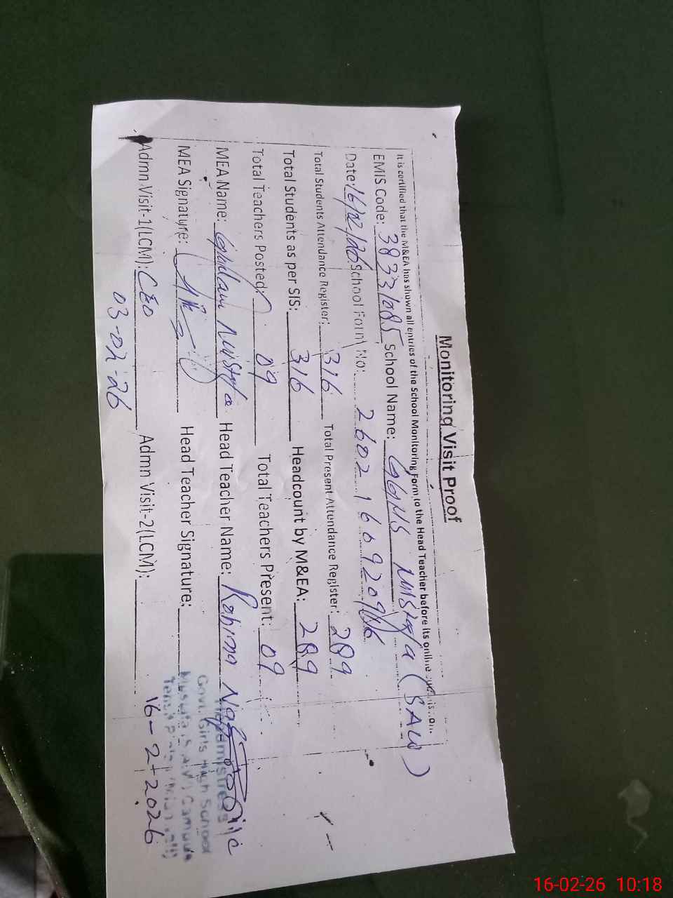 | Attendance Register | Head Teacher | MEA with School | Visit Proof |
