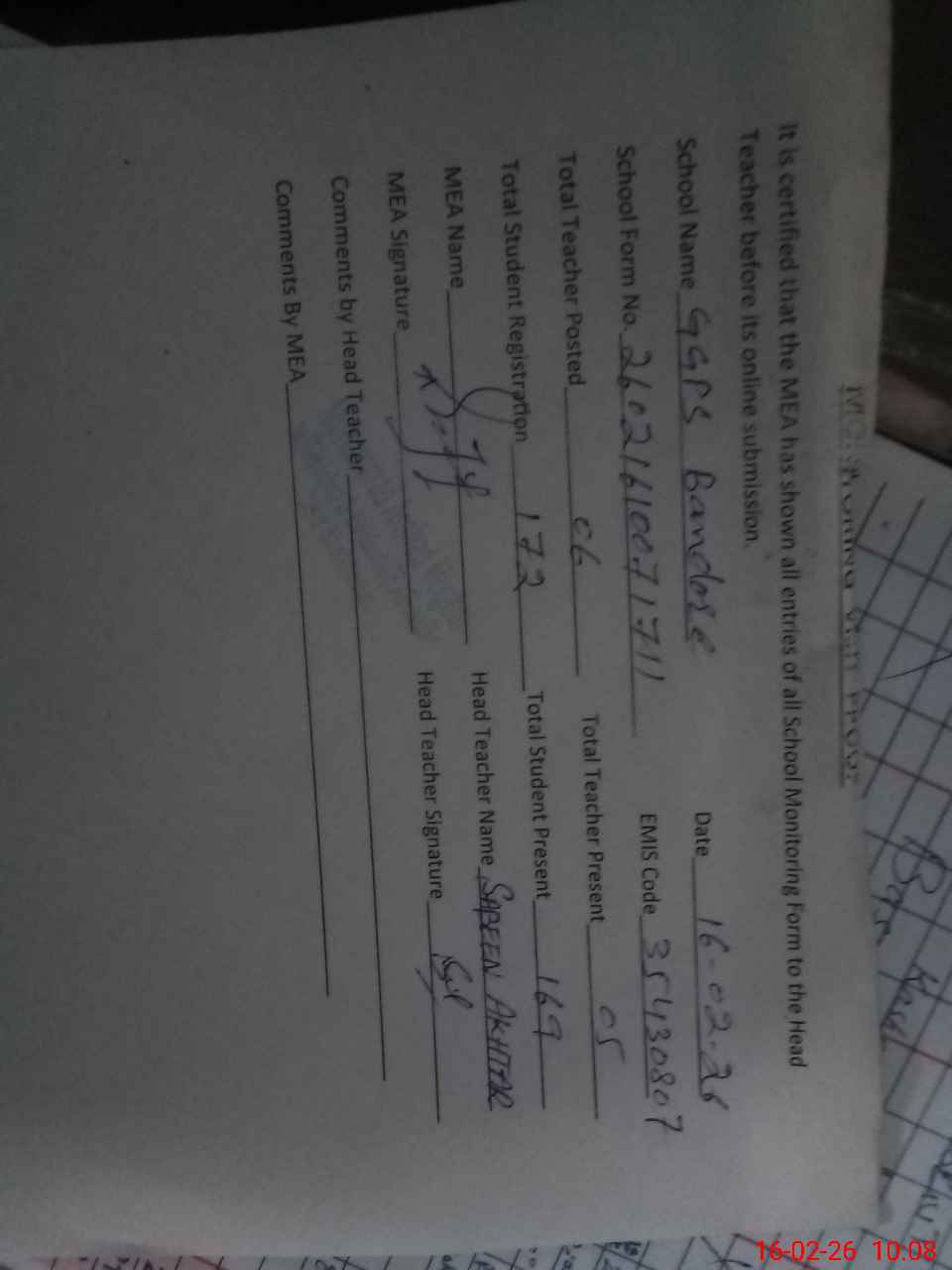 | Certified that this School was Inspected by the Undersigned MEA/DMO Today and the Information Stated Above is as Per Record. | |||||