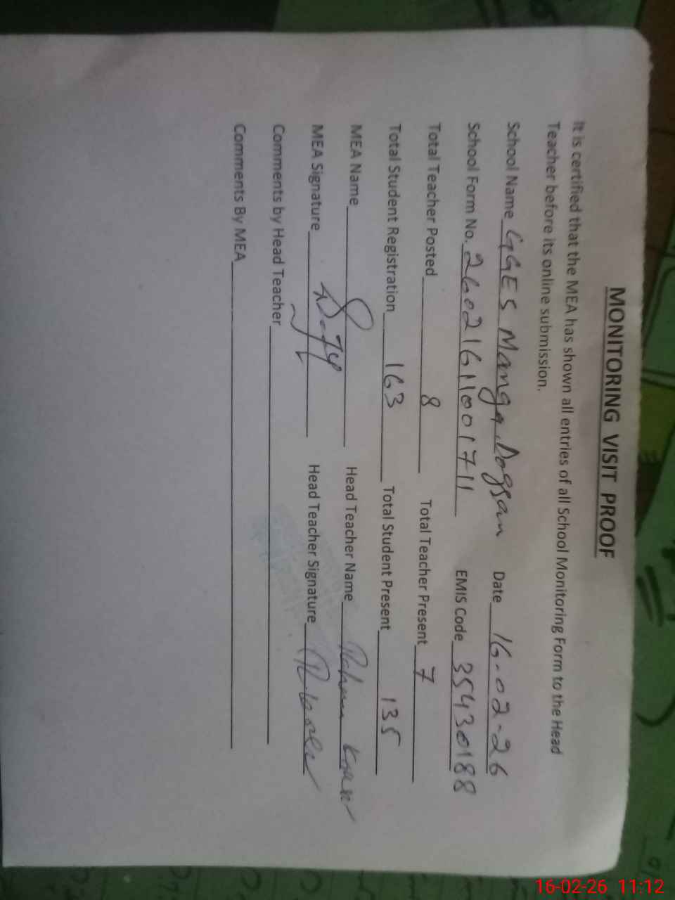 | Attendance Register | Head Teacher | MEA with School | Visit Proof |