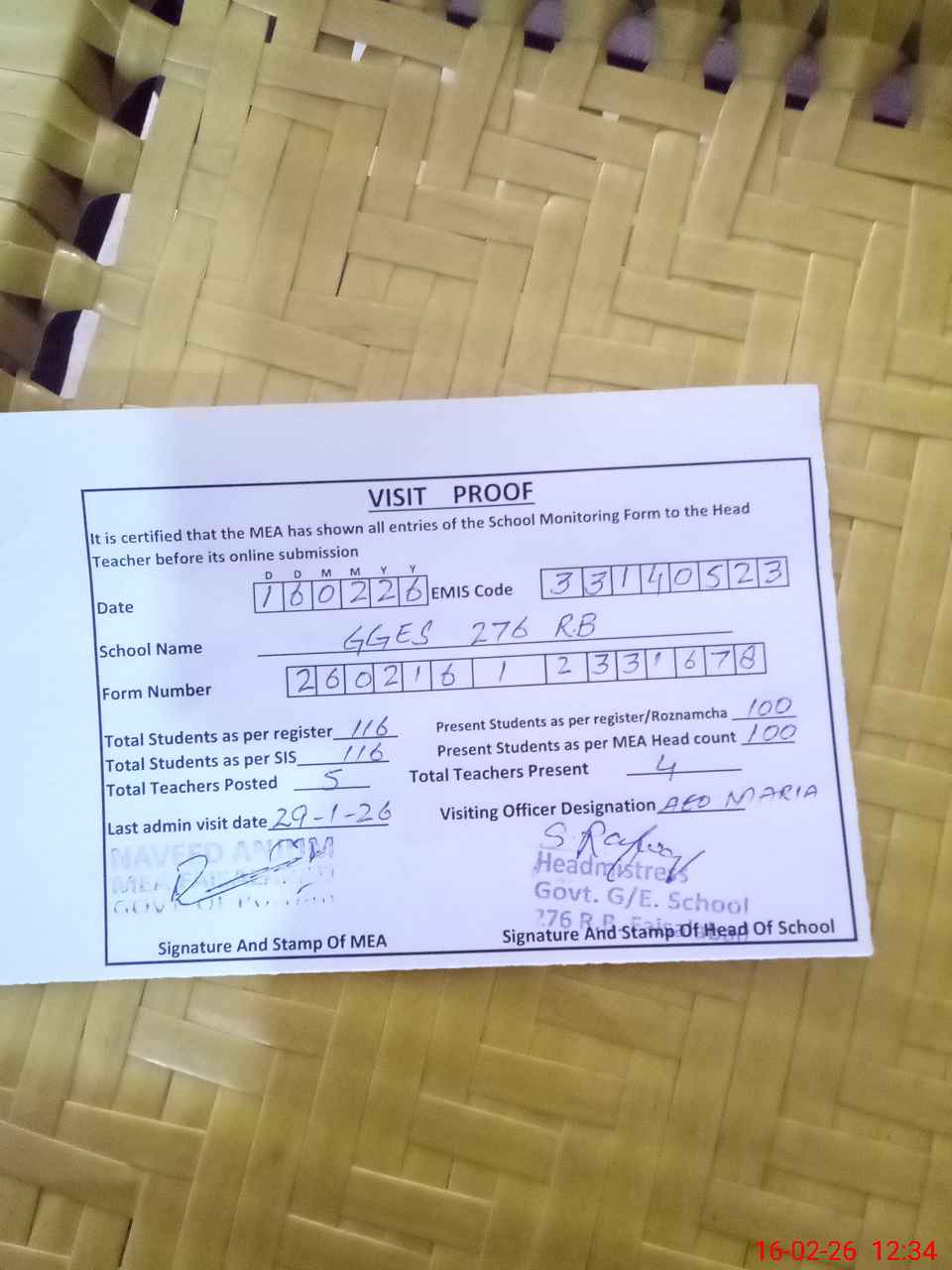 | Attendance Register | Head Teacher | MEA with School | Visit Proof |
