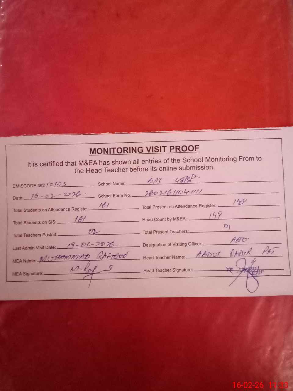 | Attendance Register | Head Teacher | MEA with School | Visit Proof |