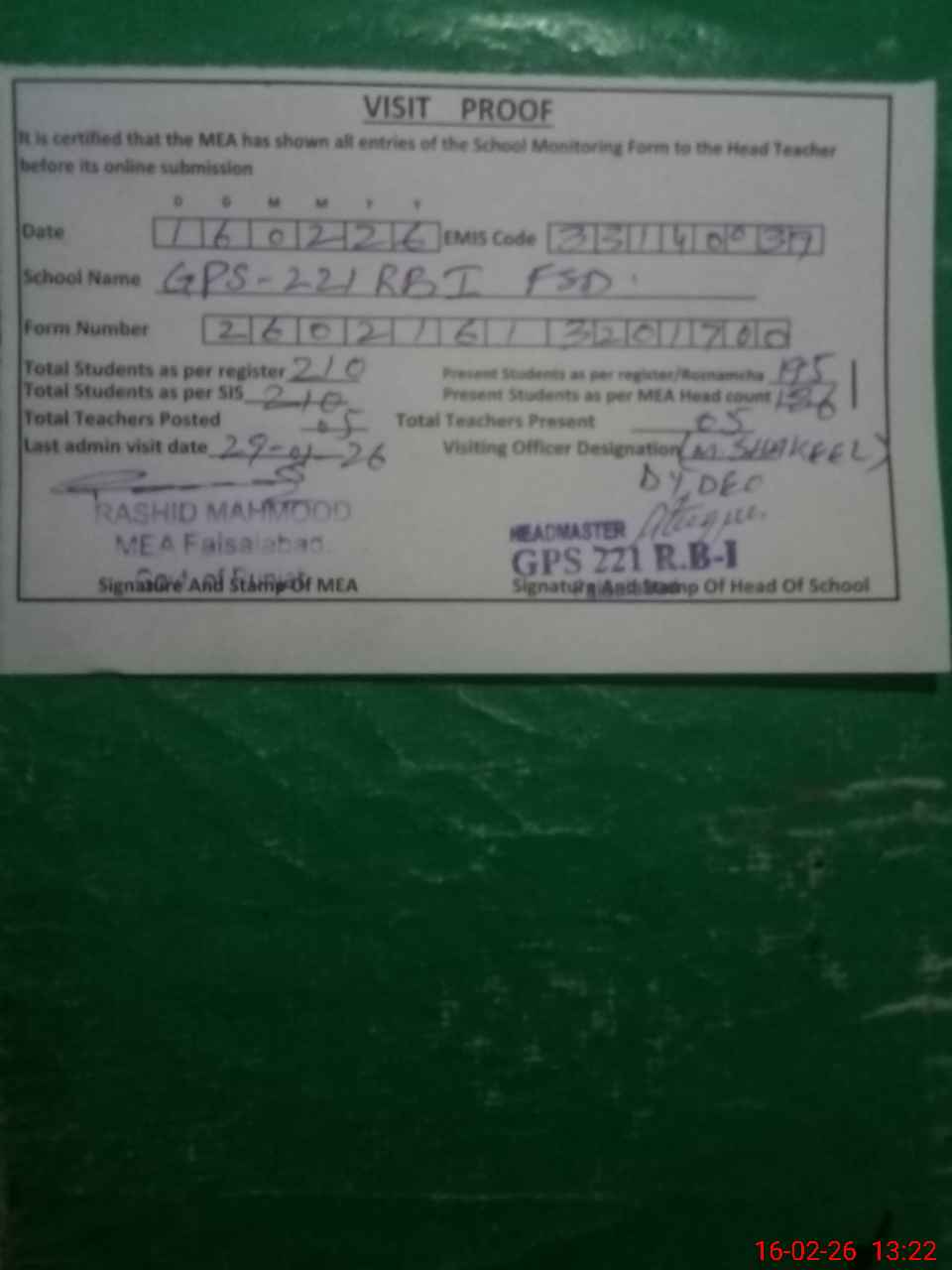 | Certified that this School was Inspected by the Undersigned MEA/DMO Today and the Information Stated Above is as Per Record. | |||||