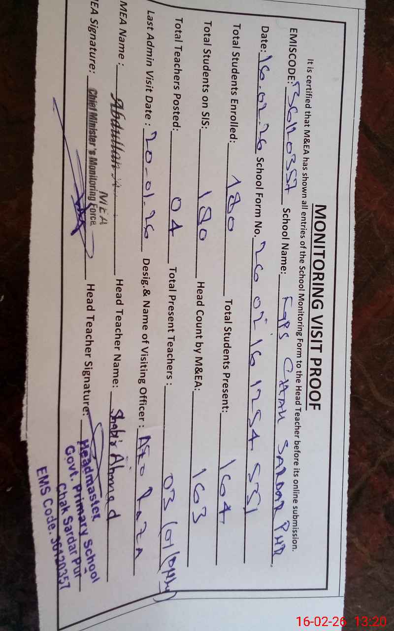 | EMIS Code: 36120357 | Name of School: GPS CHAK SARDAR PUR MOZA SHAH PUR UBHA | |||