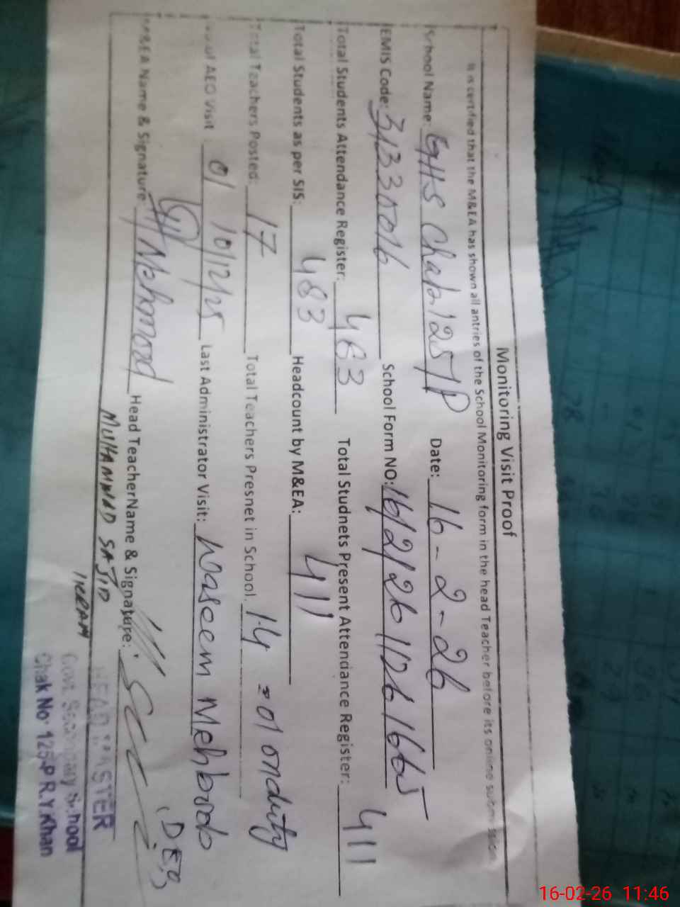 | Attendance Register | Head Teacher | MEA with School | Visit Proof |