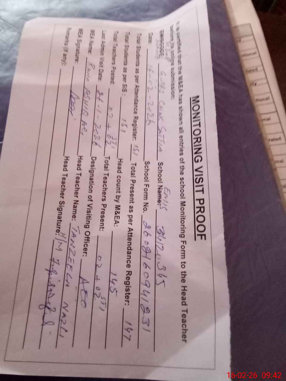 | Attendance Register | Head Teacher | MEA with School | Visit Proof |