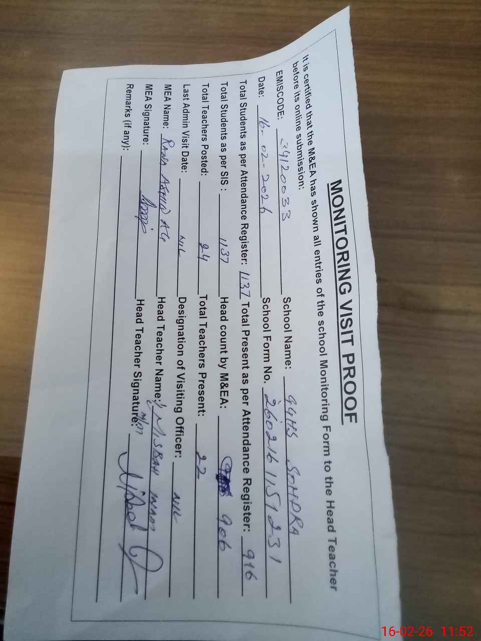 | Attendance Register | Head Teacher | MEA with School | Visit Proof |