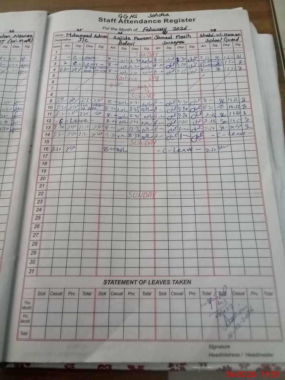 | CNIC | Full Name | Designation | R/C | Absence During Last Calender Month |