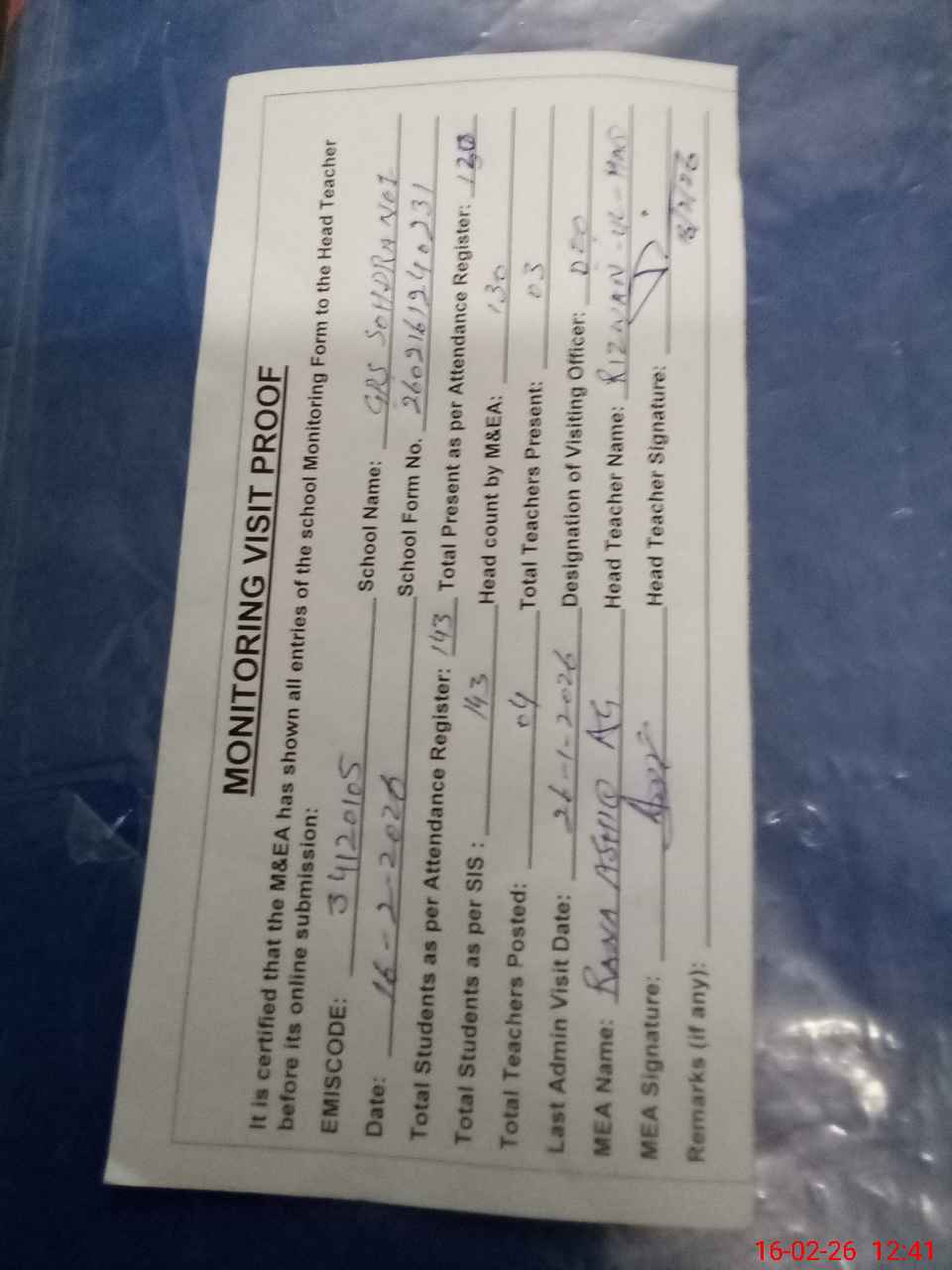 | Attendance Register | Head Teacher | MEA with School | Visit Proof |