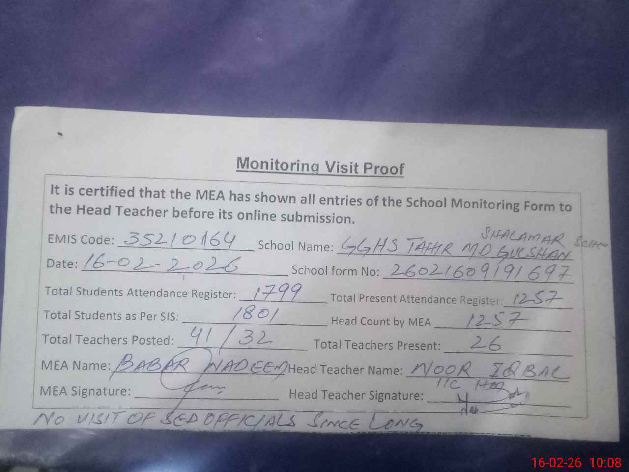 | Attendance Register | Head Teacher | MEA with School | Visit Proof |