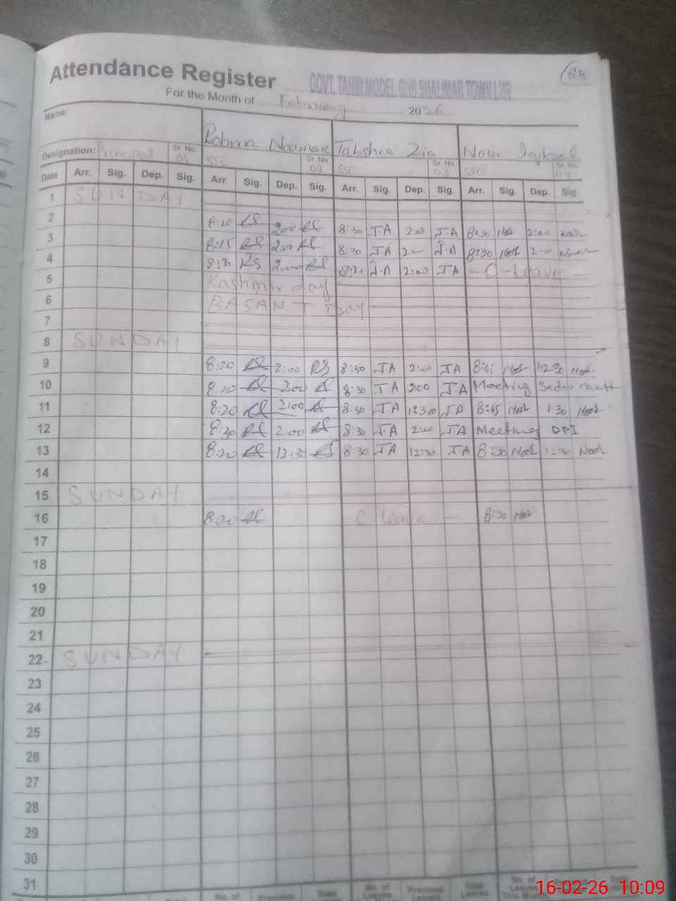 | CNIC | Full Name | Designation | R/C | Absence During Last Calender Month |